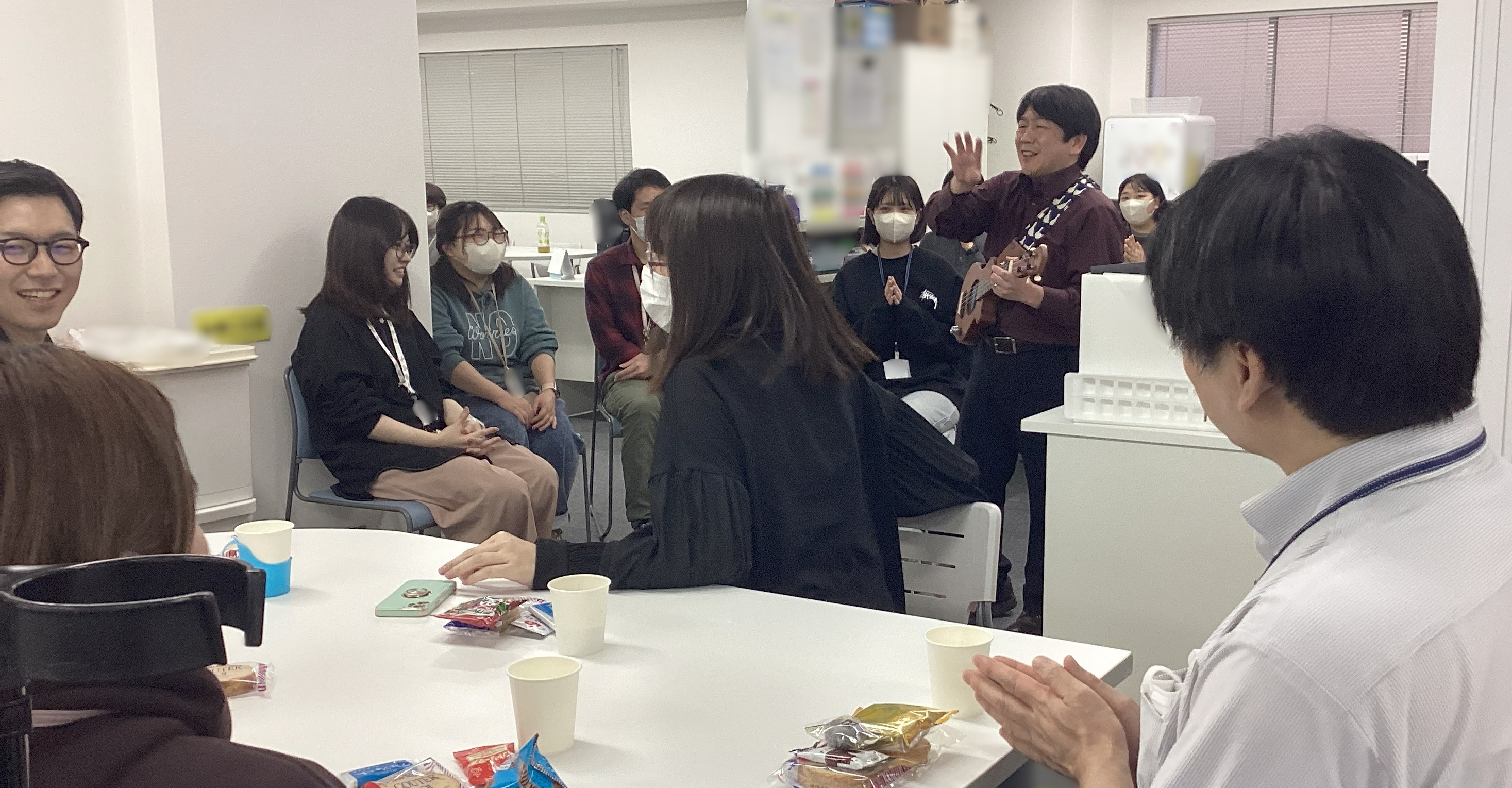 懇親会の終わりにはセンター長からのサプライズ演奏が!ウクレレを片手に「ハッピープライスパラダイス♪」とお馴染みのテーマソングを歌いました。「ダイソー!」の合いの手を皆さんで……と促されたのですが照れくさかったのか、皆さん控えめな声でのコールアンドレスポンス!楽しい時間はあっという間でした。