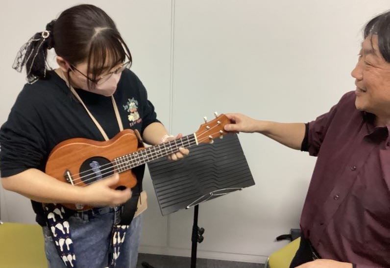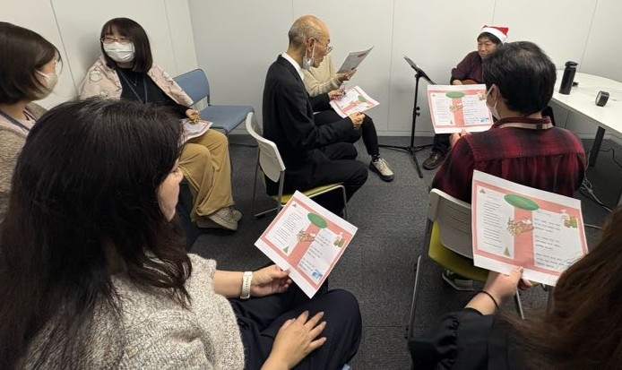 歌詞カードを手にスタッフさんたちが席に着くと演奏が始まりました。ウクレレの軽やかであたたかい音色とセンター長の歌声(良い声!)に笑顔がこぼれます。ある人は一緒に歌い、ある人はお菓子を食べながら音楽に浸り、各々楽しみました。